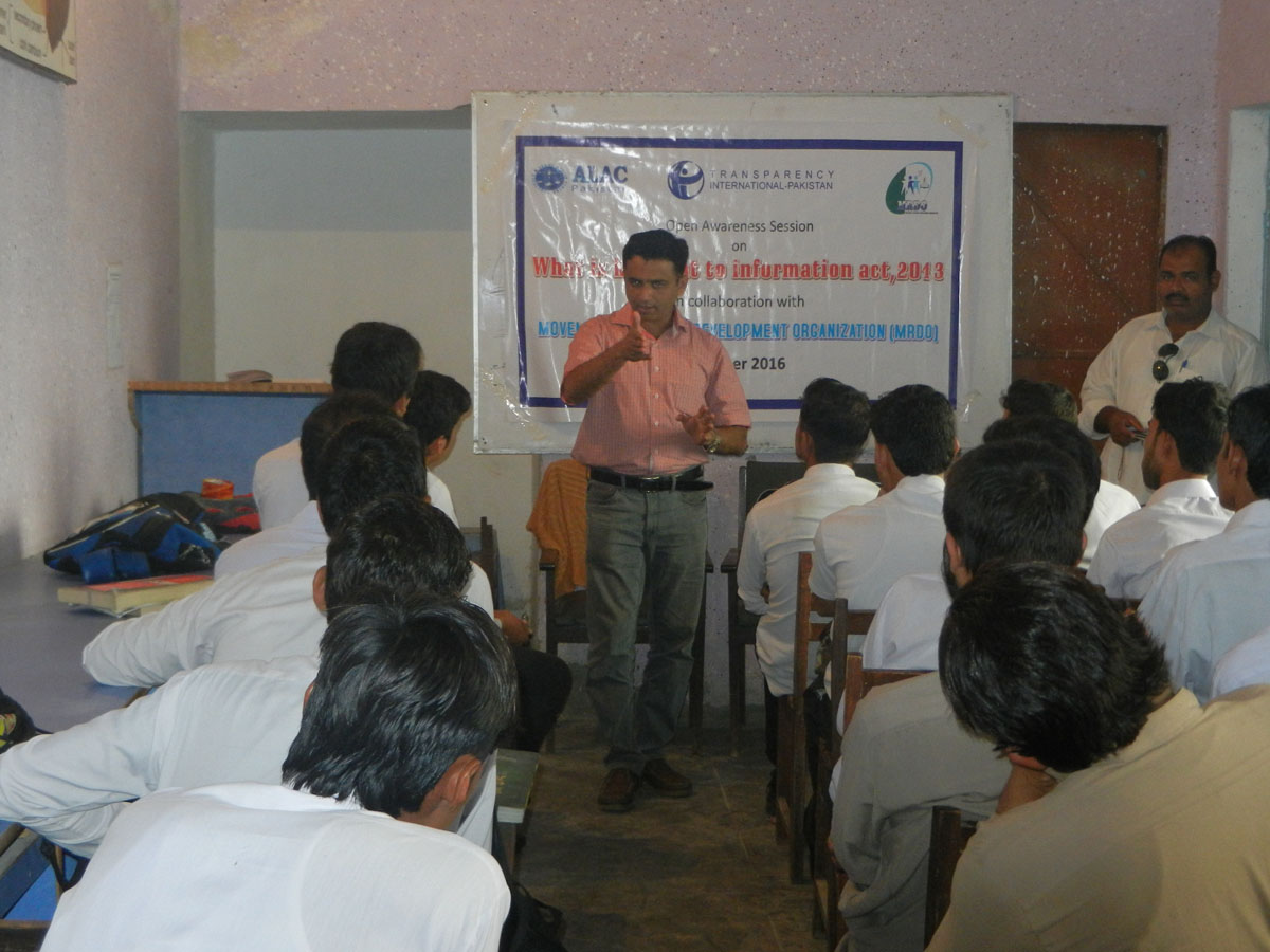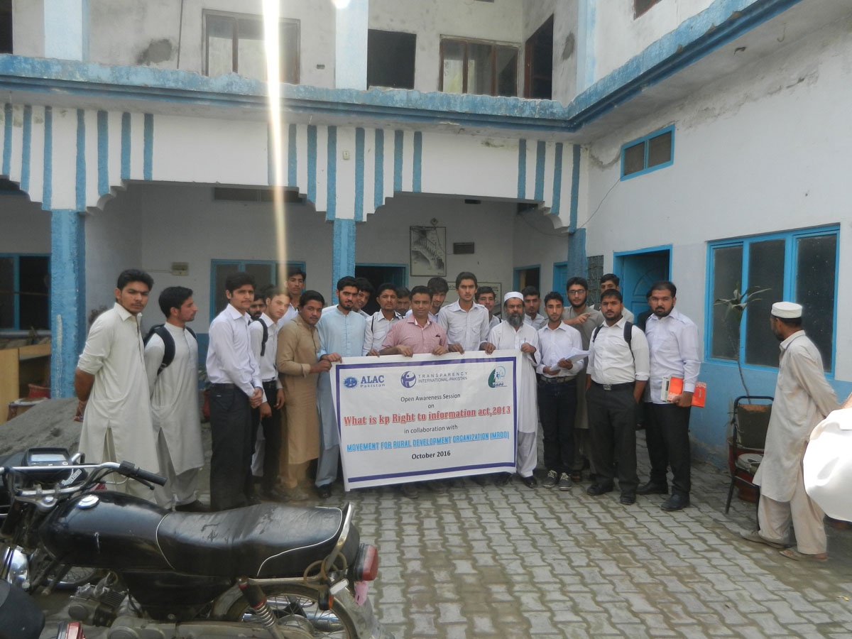 Right to Information (RTI) session was arranged in Nice College, Mardan where 30 students participated in the session. The session was organized in collaboration with Movement for Rural Development Organization (MRDO) and Nice College Administration. The students took keen interests in the law which empowers them to ask questions with the government for getting information related to budgeting, development, public administration, police and local bodies functioning. The session lasted 40 minutes in which students asked questions about the RTI request.