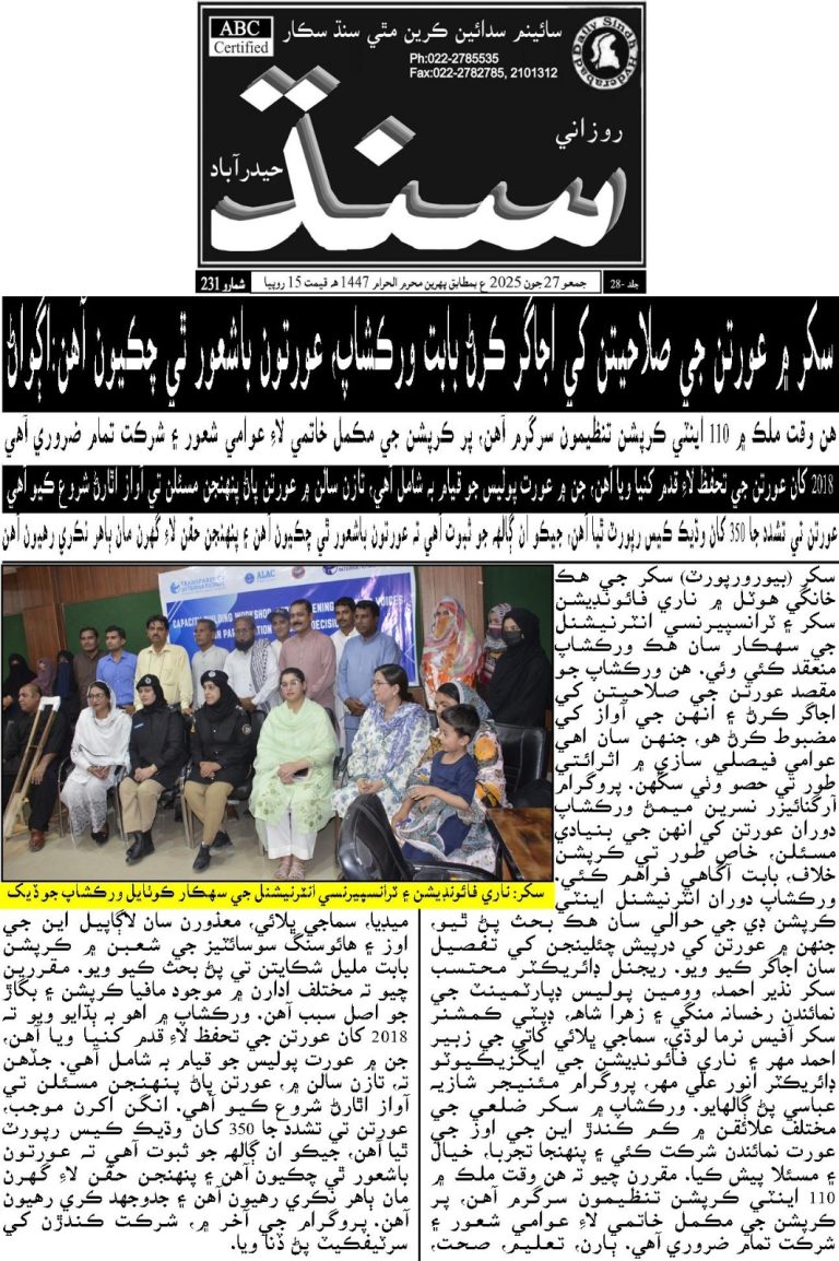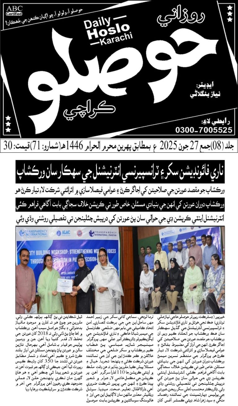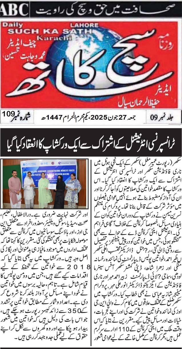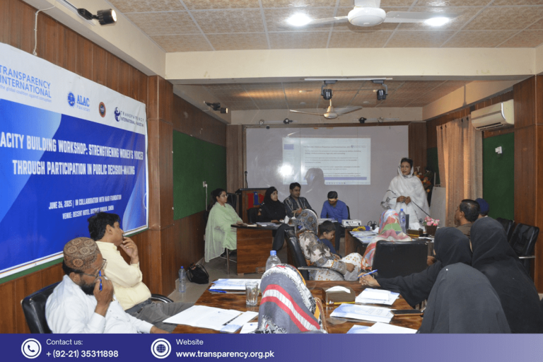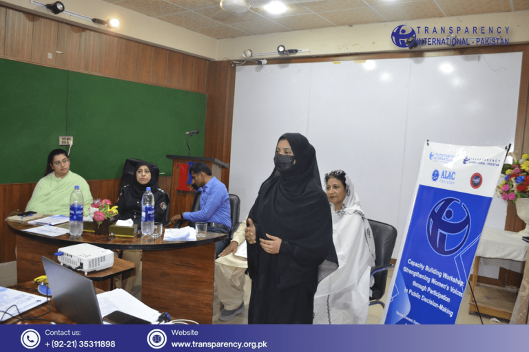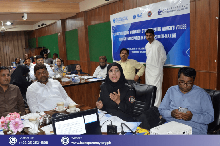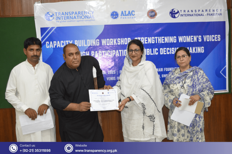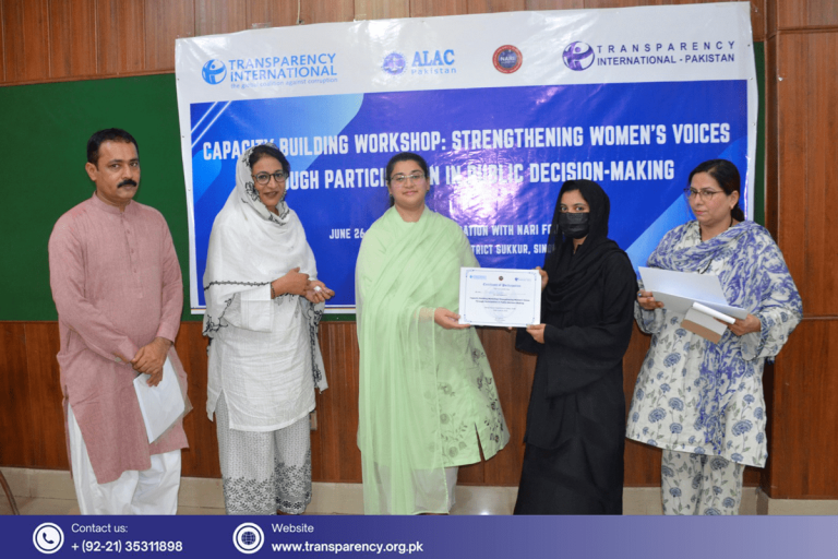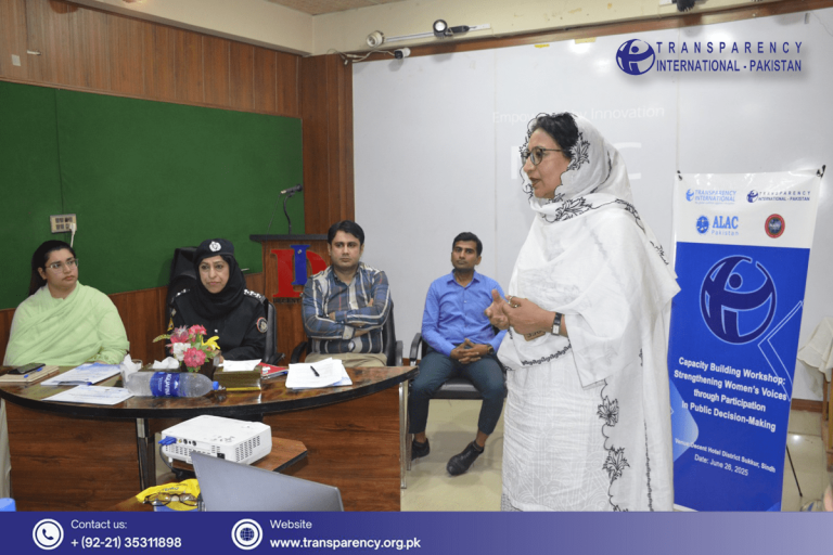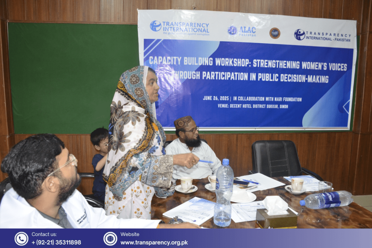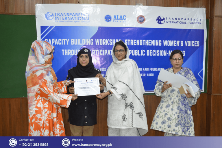 Transparency International Pakistan (TI Pakistan) in collaboration with NARI Foundation, Sukkur organized a training workshop in District Sukkur, Sindh. The workshop aimed to empower women with social accountability tools, enabling their voices to be heard and their contributions to shape inclusive policies and governance frameworks within public decision-making processes.