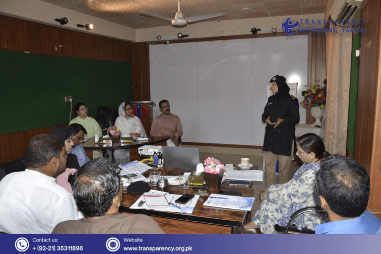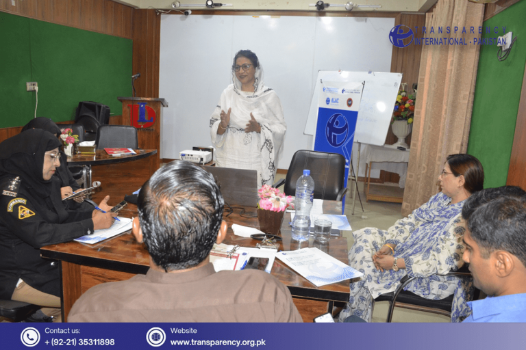 At the beginning of the workshop, pre-test forms were distributed to assess participants’ prior knowledge of the session’s topics. In the first session, Ms. Rukhsana Mangi, incharge of the Women Protection Cell (WPC) Sukkur, shared insights into the cell’s proactive role in supporting female victims of violence and different forms of abuse including the gendered dimension of corruption. She noted a significant increase in women’s awareness of their rights over the past few years. The WPC offers practical solutions to women facing challenges, referring cases to police and different institutions when necessary.