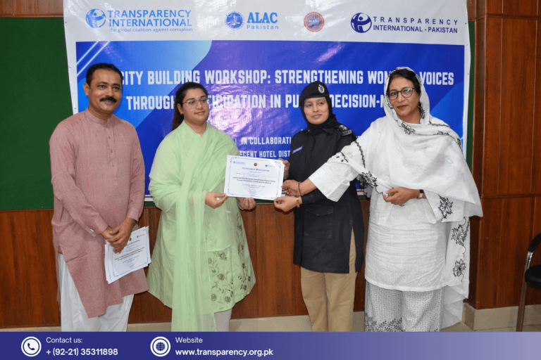 The workshop concluded with a post-test, and certificates distribution. The Participants expressed their gratitude to Transparency International Pakistan and the NARI Foundation for fostering a supportive environment that encouraged open discussions on sensitive issues and empowered women to actively engage in public decision-making.Top of Form
