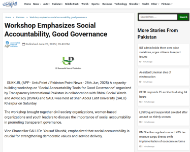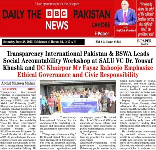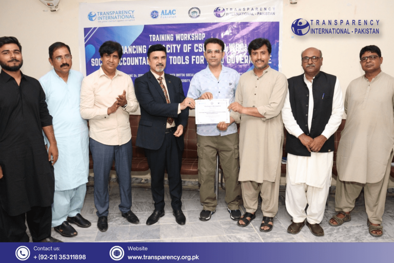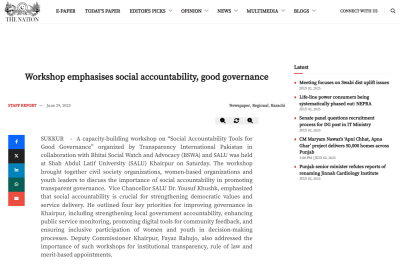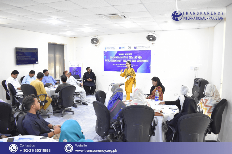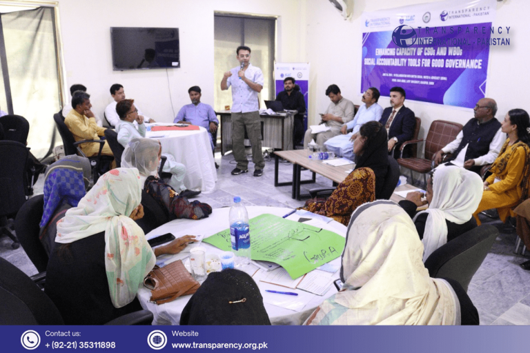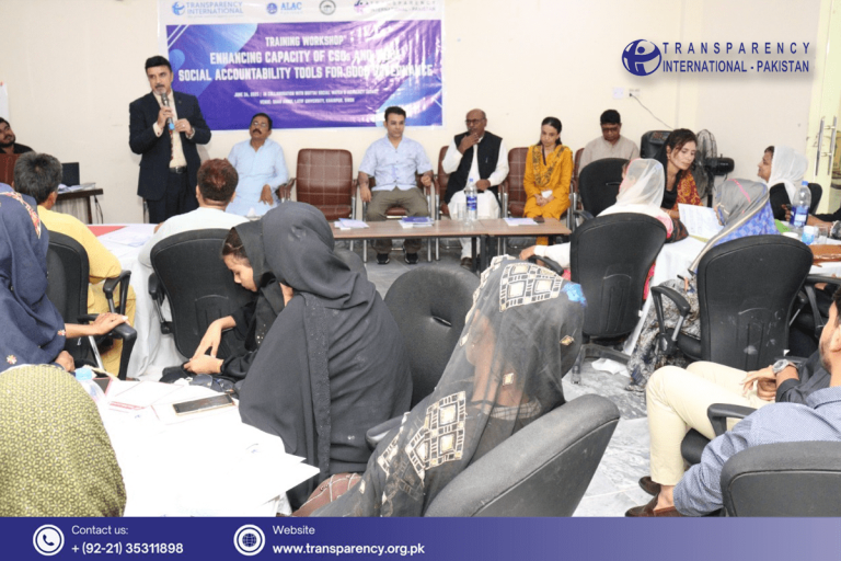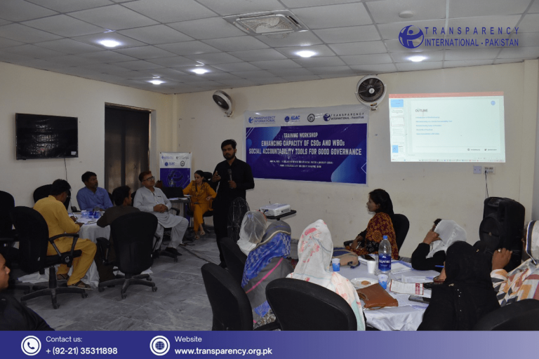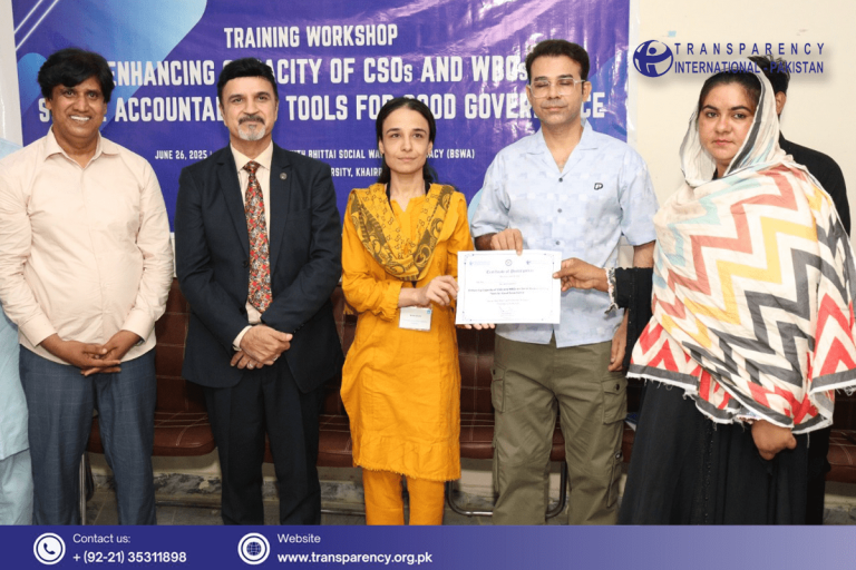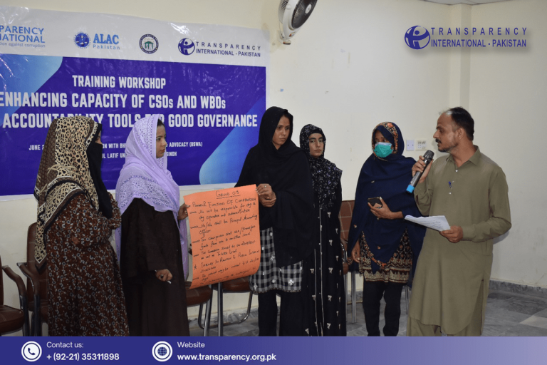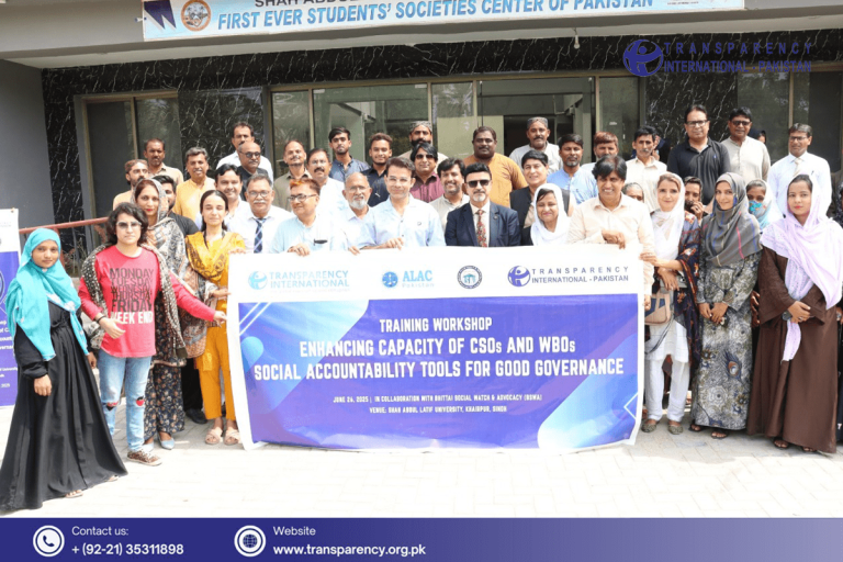 Transparency International Pakistan, in collaboration with Bhittai Social Watch & Advocacy (BSWA), organized a capacity-building training workshop at Shah Abdul Latif University district Khairpur, Sindh. The workshop aimed to enhance the capacity of Civil Society Organizations (CSOs) and Women-based Organizations (WBOs) on anti-corruption mechanisms and social accountability tools. The workshop brought together representatives from CSOs, WBOs, journalists and district administration.