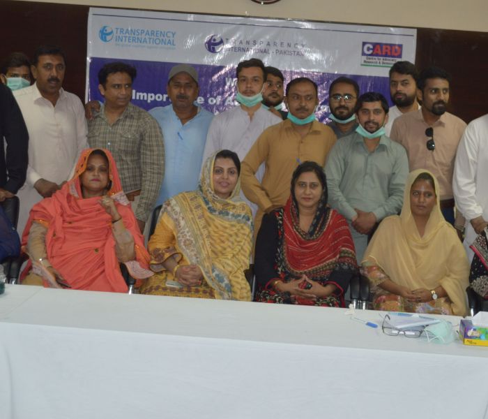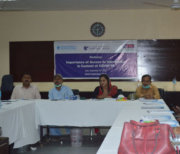Transparency International Pakistan in collaboration with Centre for Advocacy Research & Democracy (CARD) organized a workshop in district Hyderabad, Sindh on the topic: “Importance of Access to Information in COVID -19 Context”. The workshop was attended by 32 participants including 12 females. Different segments of people included students, teachers, volunteers, transgenders, minorities, government workers, journalists and social workers attended the workshop and participated actively.