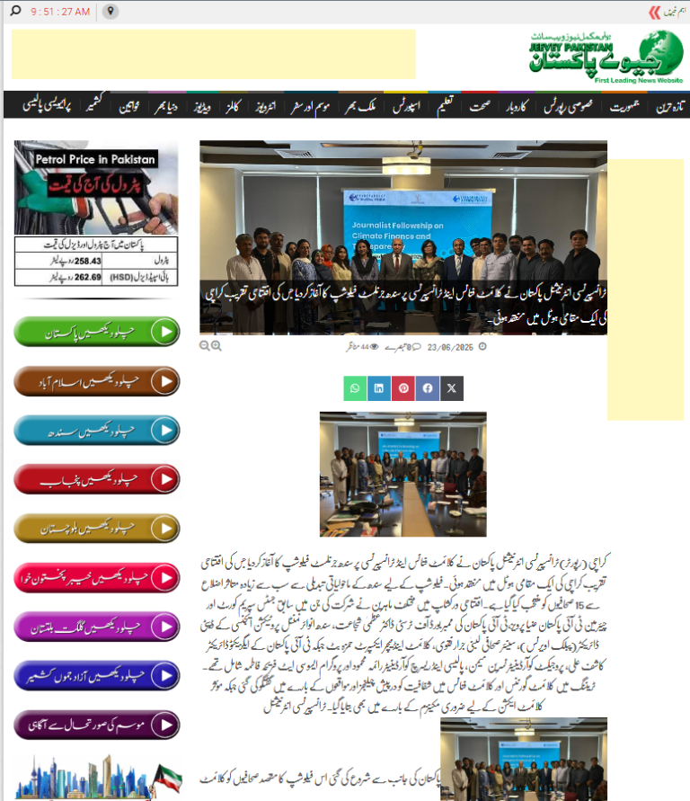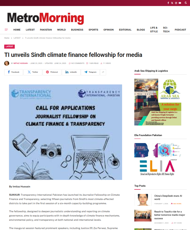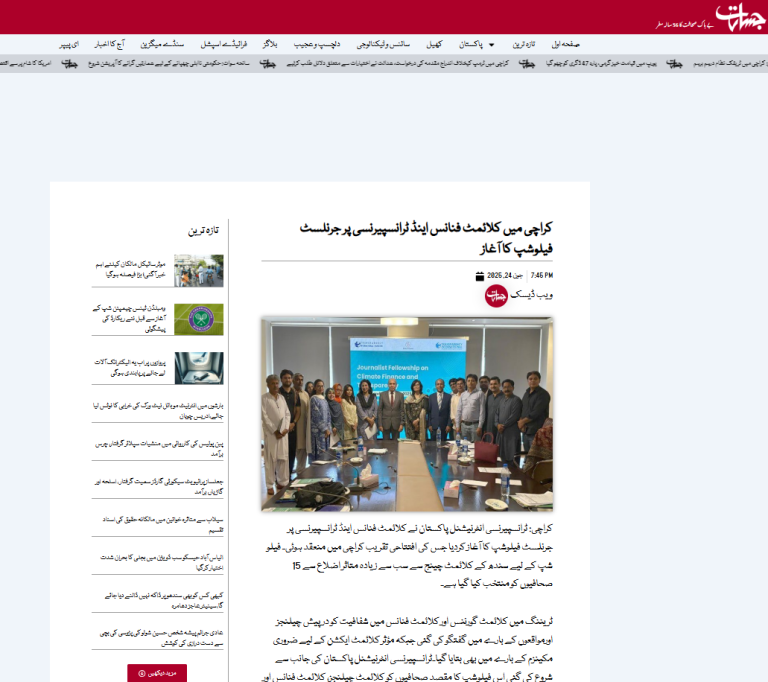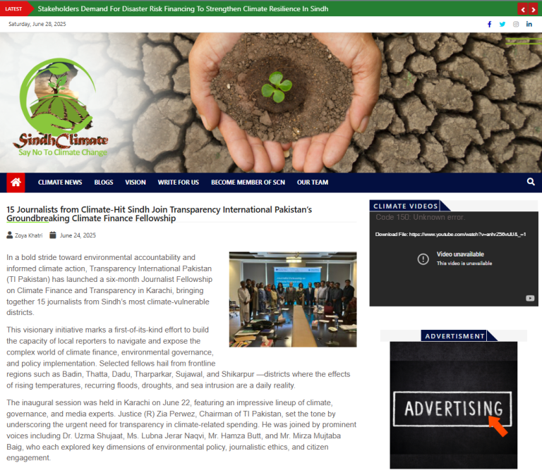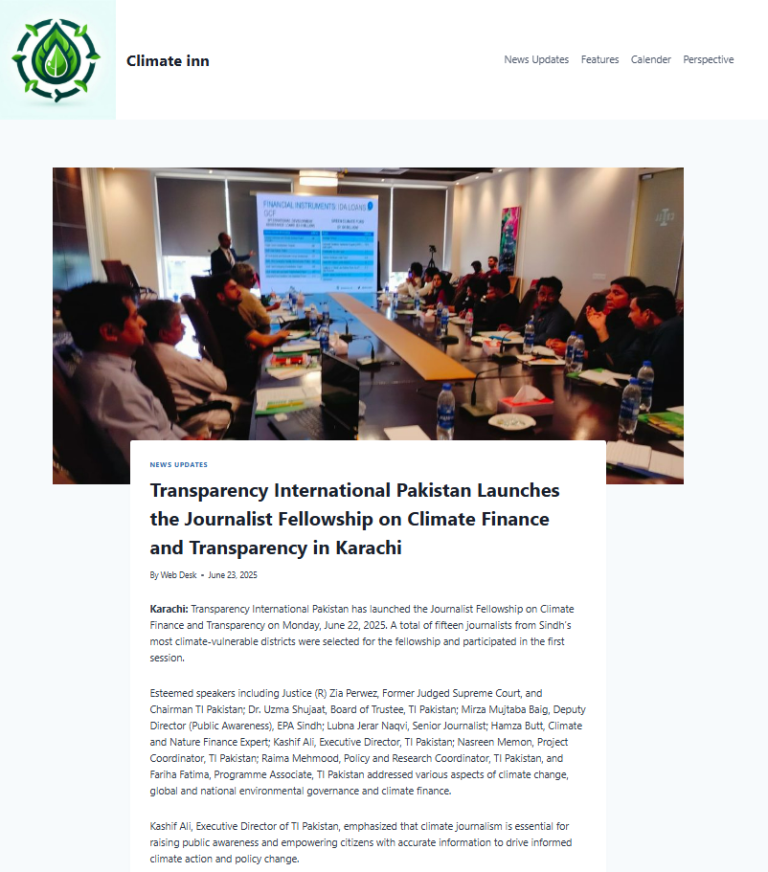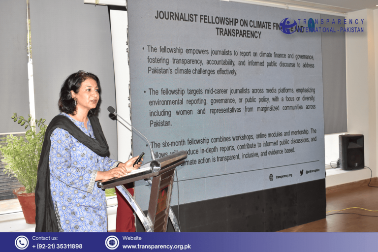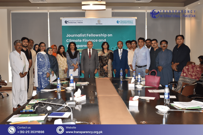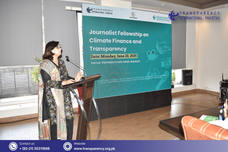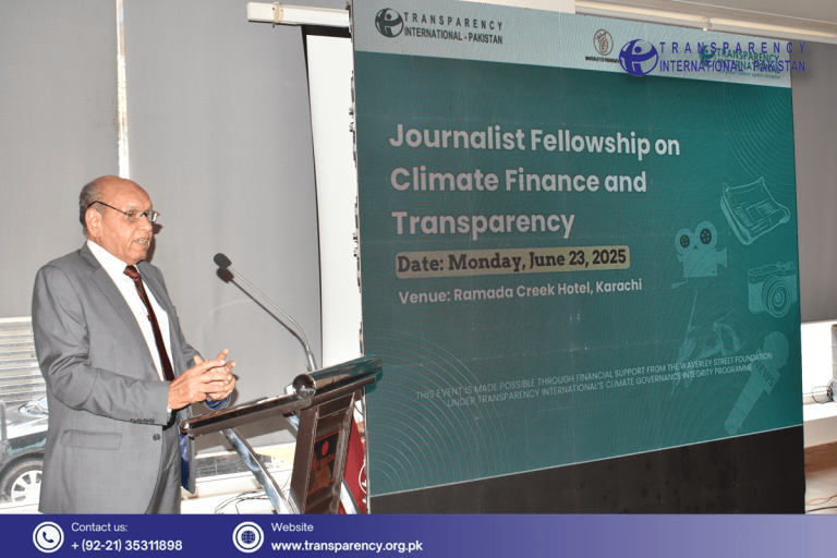 Transparency International Pakistan formally launched six-month long Fellowship Programme for Journalists on Climate Finance and Transparency. The launching ceremony took place on Monday, June 23, 2025 at Ramada Creek Hotel, Karachi. The fellowship brought together 15 journalists from across the province. Experts specializing in climate change, governance, and journalism also participated in the training, providing in-depth insights, practical tools, and guidance to help journalists enhance their reporting and understanding of these critical issues.