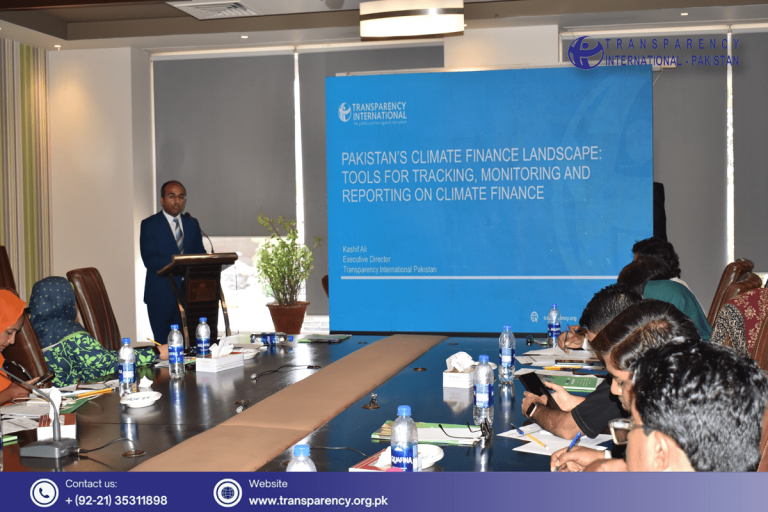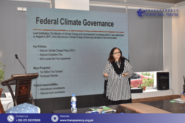 Afterwards, Mr. Kashif Ali, Executive Director, TI Pakistan provided a detailed presentation on Pakistan’s Climate Finance Landscape: Tools for Tracking, Monitoring and Reporting on Climate Finance by Journalists. He explained the concept of climate financing that includes funds to support mitigation (reducing emissions) and adaptation (adjusting to climate impacts). He provided an overview of the channels through which climate finance is received, as well as the key sectors where it is utilized, including renewable energy, climate-resilient infrastructure, water management, and disaster risk reduction.