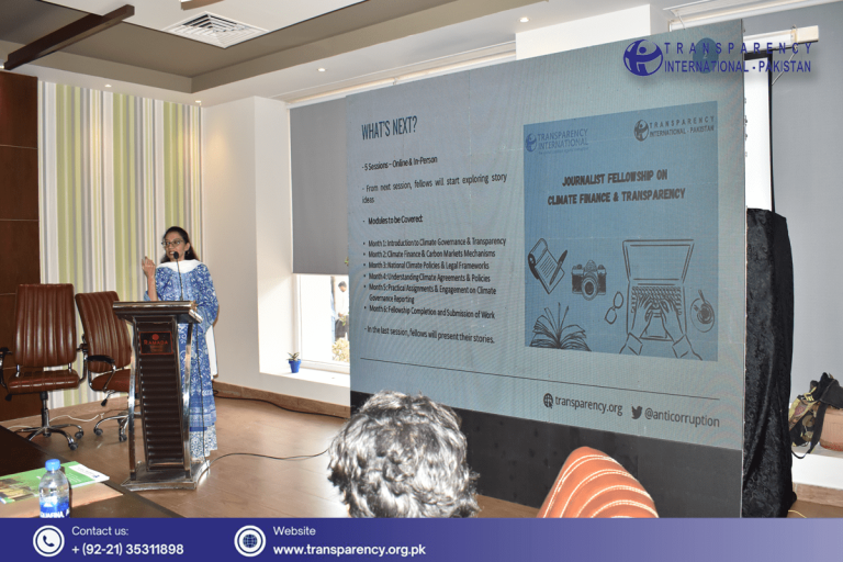 The event concluded with briefing on the next steps of the fellowship, followed by concluding remarks by Justice (R) Zia Perwez, Chairman, TI Pakistan. He commended the participants for their active engagement throughout the day and recognized their crucial role in advancing transparency in climate action. He acknowledged the fellows’ dedication to responsible journalism and encouraged them to continue using their platforms to advocate for climate justice and informed public discourse.