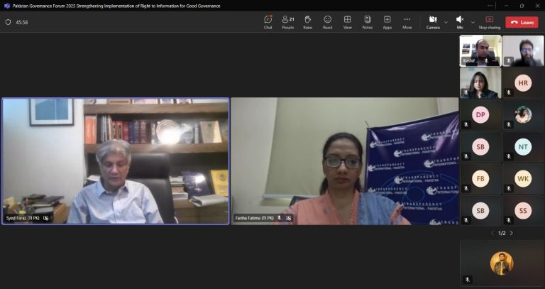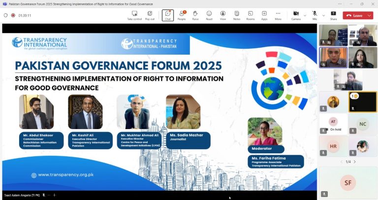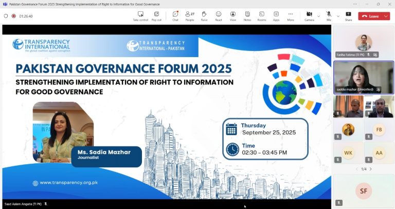 On the occasion of the International Day for Universal Access to Information (IDUAI), celebrated on September 28, Transparency International Pakistan hosted an online high-level forum Pakistan Governance Forum 2025: Strengthening Implementation of Right to Information for Good Governance. The forum aimed to reflect on Pakistan’s progress in implementing Right to Information (RTI) laws and to identify practical steps toward closing the gaps in access, enforcement, and public awareness.
