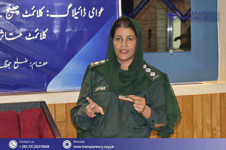 Mr. Sajid Siyal, CEO of PWS, welcomed participants and outlined the severe climate challenges facing District Jhang. He highlighted the catastrophic 2022 floods, during which the district saw villages submerging into water, thousands of acres of farmland was devastated and many citizens were displaced. Ms. Nasreen Memon, Project Coordinator, TIP, introduced the Climate Governance Integrity Program (CGIP). She also briefed the community on TI Pakistan’s Advocacy and Legal Advice Center (ALAC), informing participants that ALAC offers free legal counsel to victims and witnesses of environmental corruption.