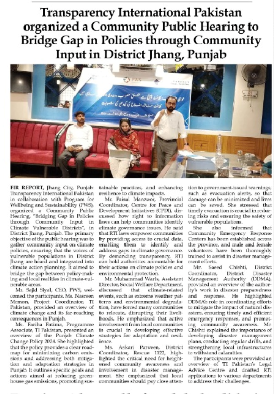 Transparency International Pakistan (TIP), in collaboration with the Program for Wellbeing and Sustainability (PWS), organized a Public Community Hearing titled ‘Bridging the Gap in Policies through Community Input’ in District Jhang, Punjab. The primary objective was to transform climate governance from a top-down implementation model into an inclusive, community-driven decision-making process.