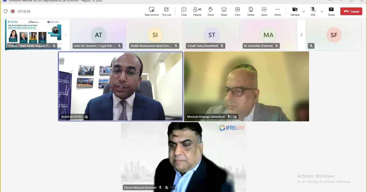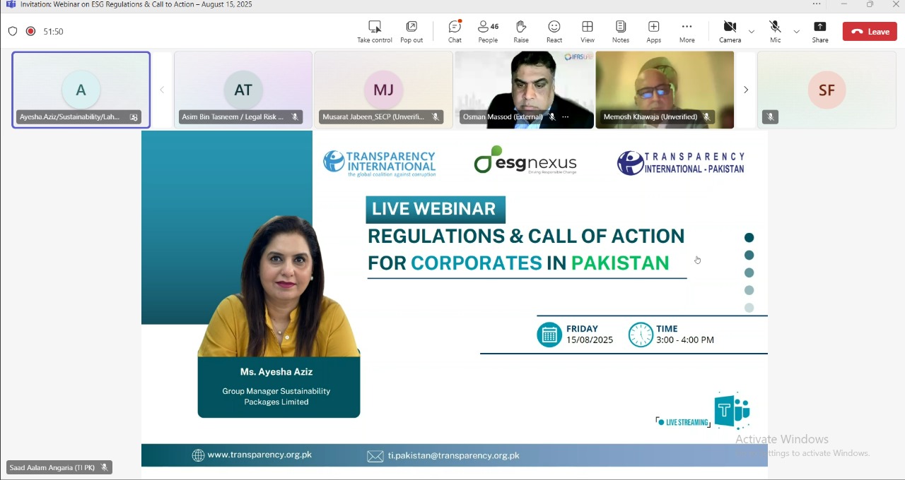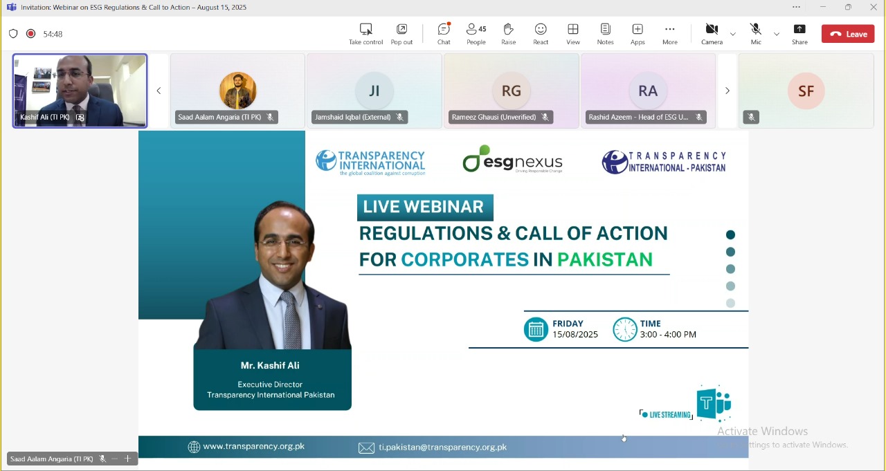 Transparency International Pakistan, in collaboration with ESG Nexus, convened a high-level dialogue on 15 August 2025 titled “Regulations and Call to Action for Corporates in Pakistan.” The online event brought together regulators, corporate leaders, sustainability professionals and representatives of civil society to discuss the evolving environmental, social and governance landscape in the country and to reflect on how businesses can respond to regulatory developments and increasing global expectations.